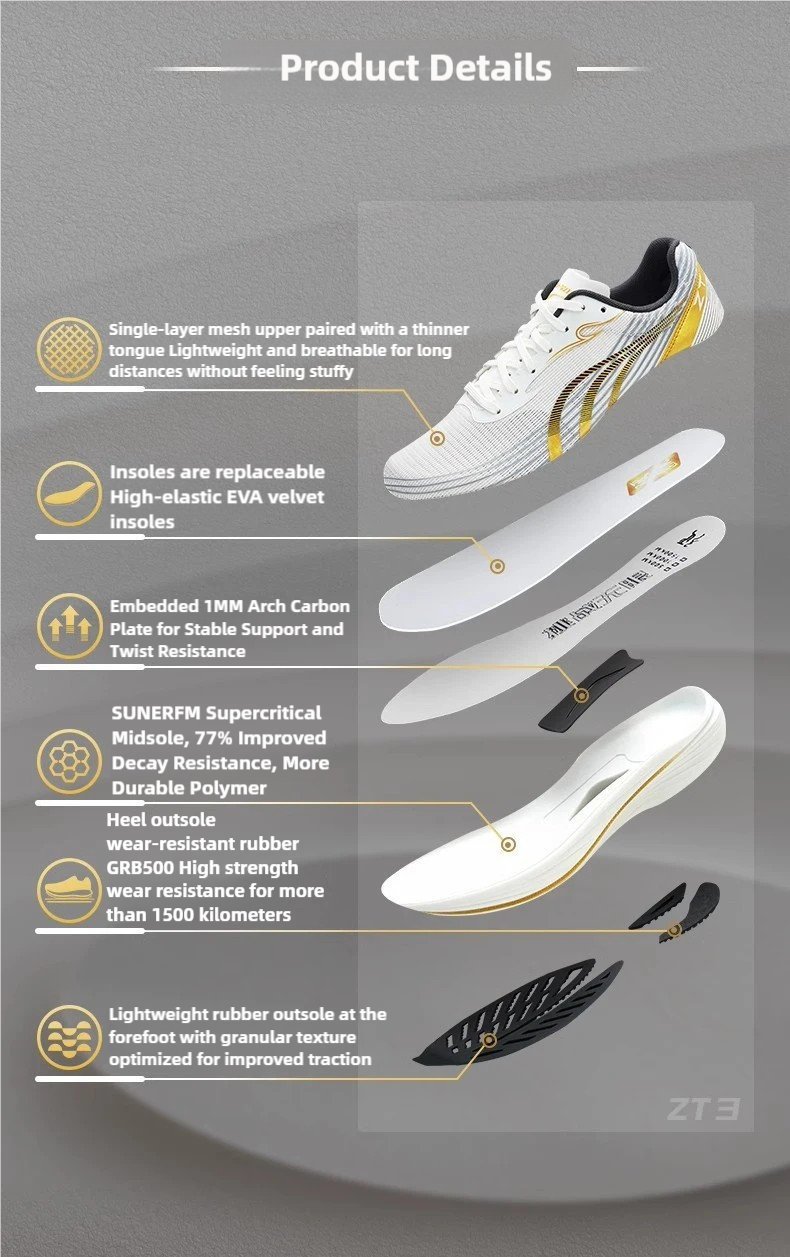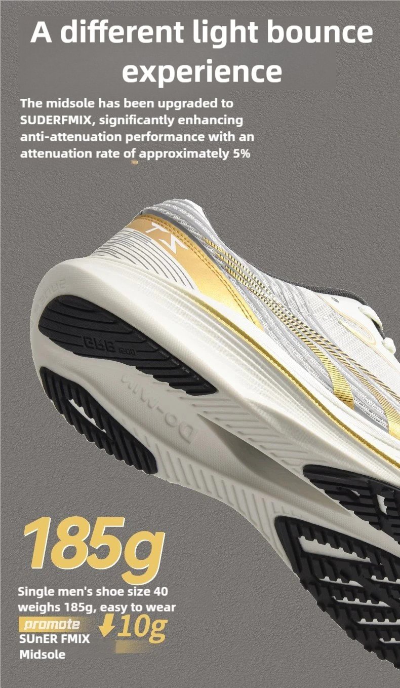 Our Carbon Plate Running Shoes are engineered for runners who demand the best in racing shoes, marathon shoes, and training shoes. Featuring an advanced carbon plate for superior energy return and propulsion, these shoes are designed to help you break records and push your limits. With a sleek white design accented by gold and black details, they combine style with functionality, making them the perfect choice for competitive races, long-distance marathons, and rigorous training sessions.