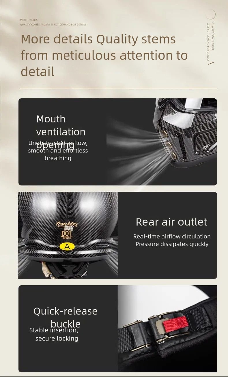 Ride with confidence in this carbon fiber helmet full face design. Engineered for maximum protection and lightweight comfort, this retro safety helmet combines vintage style with modern technology. Perfect for motorcycle cruising, touring, and everyday riding